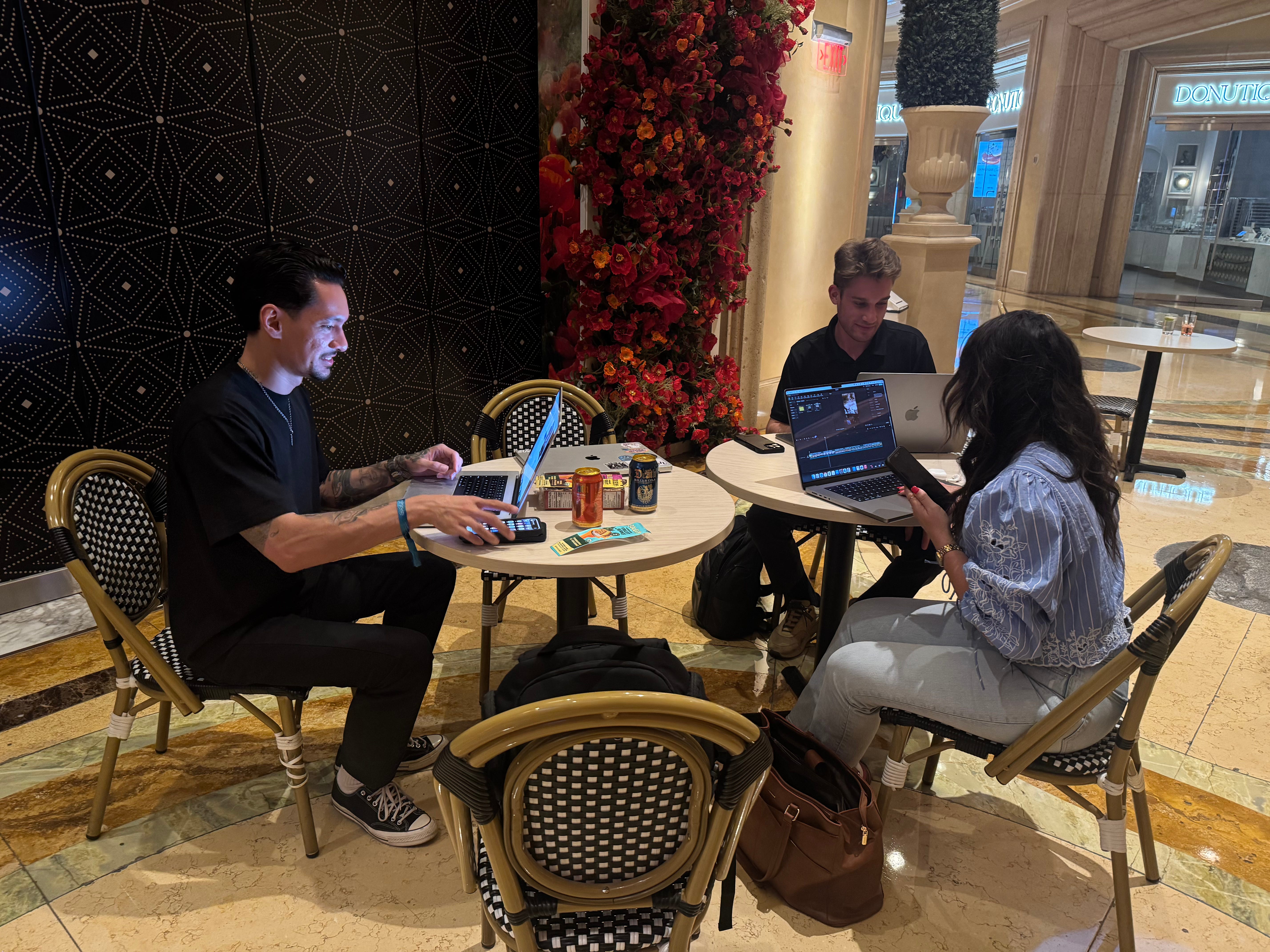 11:15 p.m. We’ve identified some tables at a closed coffee shop inside the Palazzo as our official late-night edit editing spot after the show. We grabbed our laptops, and started creating some of our more complicated spots, such as ranking the top 10 songs and Comparing 1939 clips vs 2025 clips.