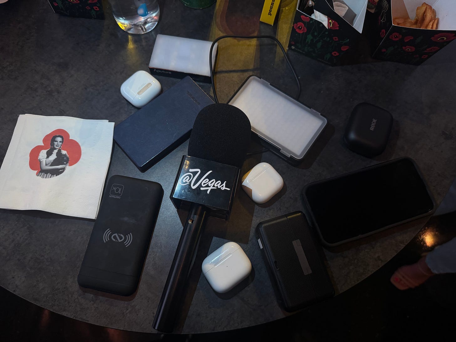 Above you’ll see our tools of the trade—AirPods to hear what we’re posting, some microphones, lights, and, most importantly, lots of charging banks.