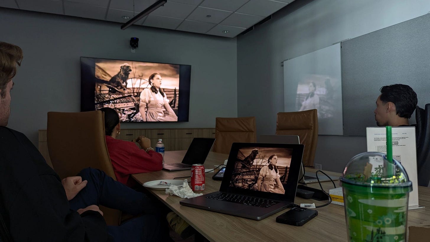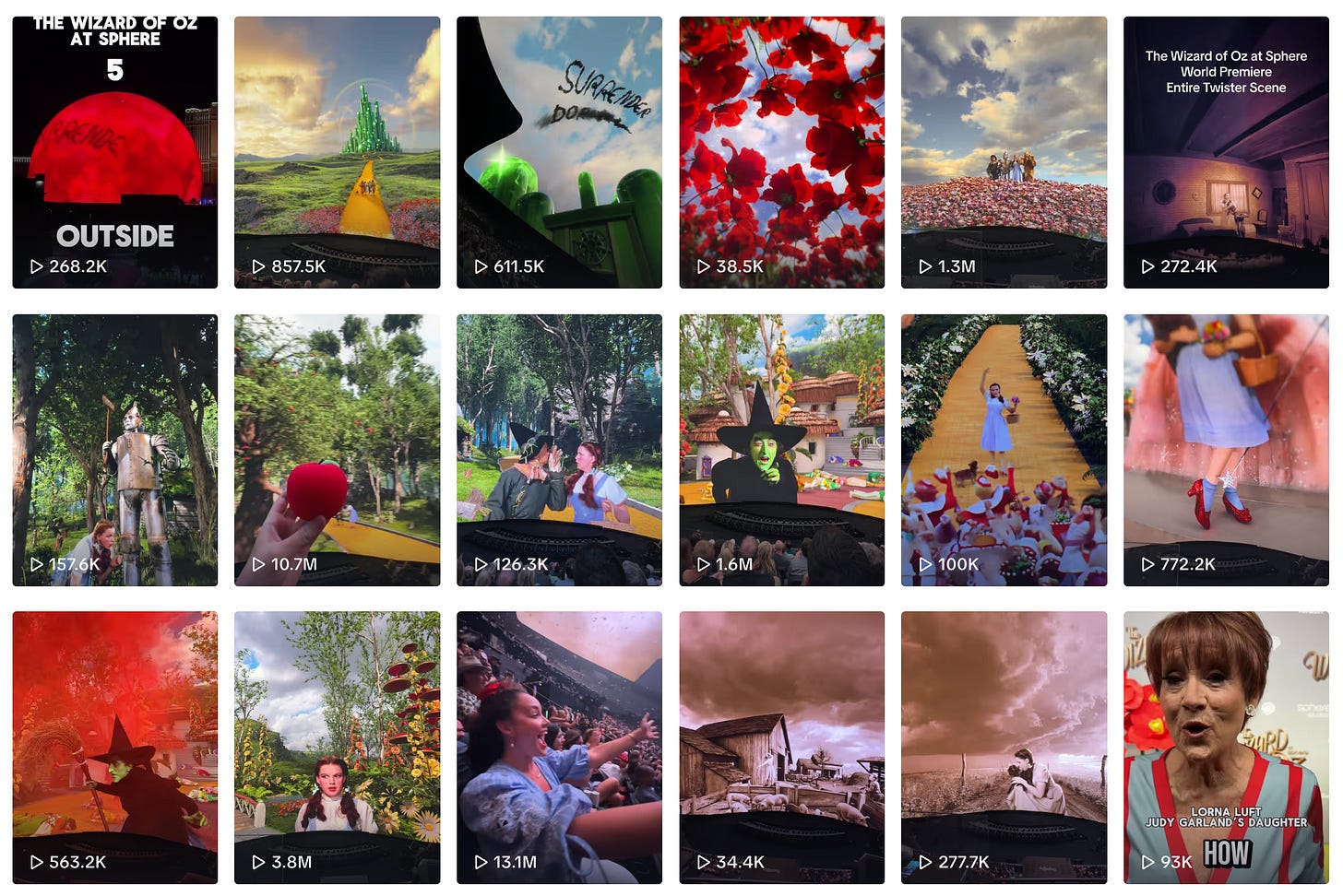 12:25 p.m. (the day before the premiere) Our four social team members attending Sphere’s premiere tomorrow watched the original Wizard of Oz over some pizza. The goal is to define moments to capture, spitball some captions, and pre-build CapCut templates. If you’ve never seen four creators debate a “twister shot,” it’s something.