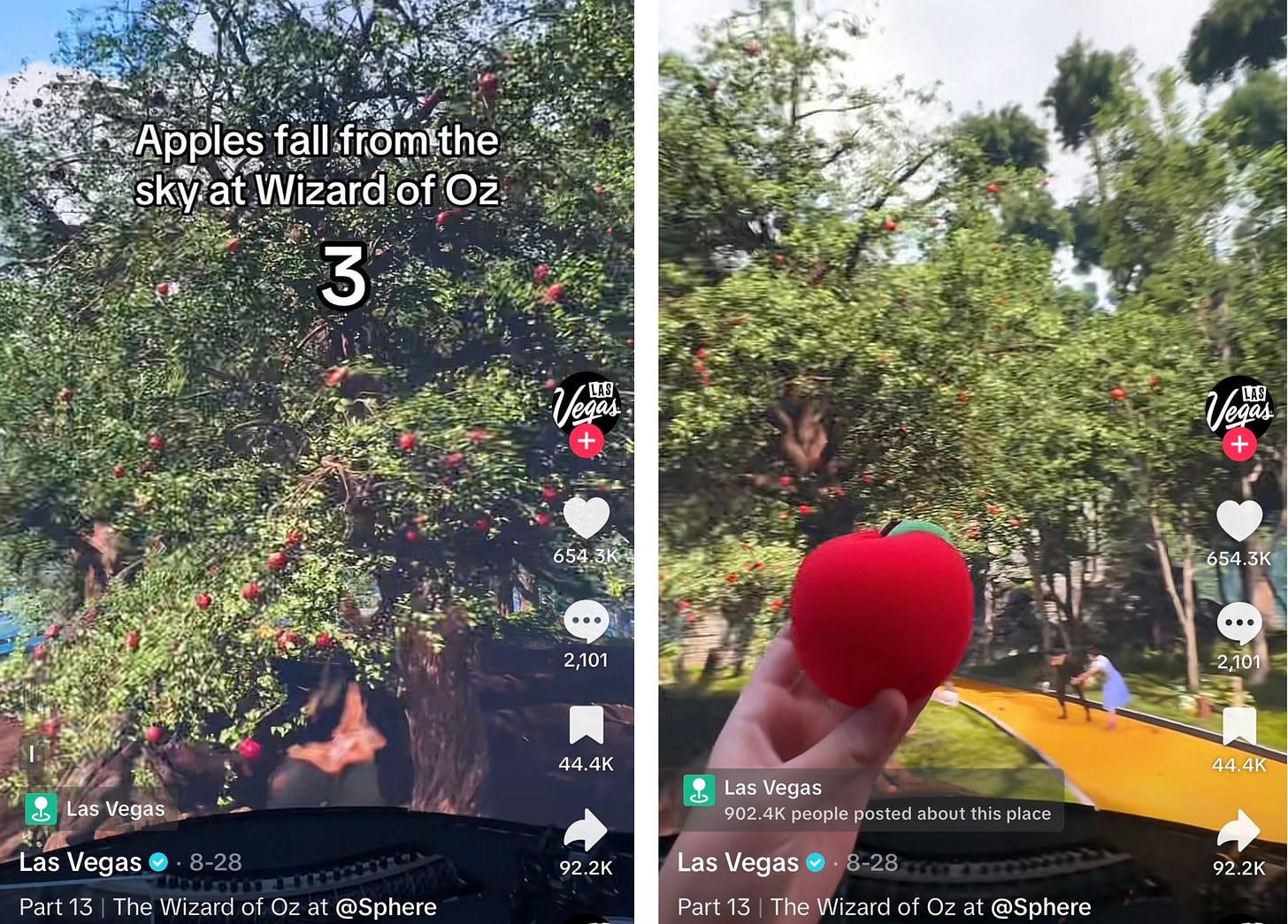 8:47 p.m. In our research, we flagged the falling apples as a must-catch moment. (Yes, the audience gets actual foam apples “thrown” at them during a specific scene.) One landed near me, and I narrowly missed the catch but the post is the @Vegas account’s third most engaged TikTok ever: 10.7M views and 9,828 new followers.
