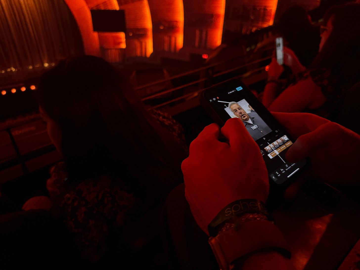 7:40 p.m. Sphere seats secured, while Owen edited his red carpet spots in CapCut while Zach and Gennah rehearsed twister shots. Picture this: you’re beside someone who is pointing to a screen while nothing is happening, and the person beside them is filming them, panning to the screen. They watch the footage, and do it again multiple times. That practice paid off around 30 minutes later.
