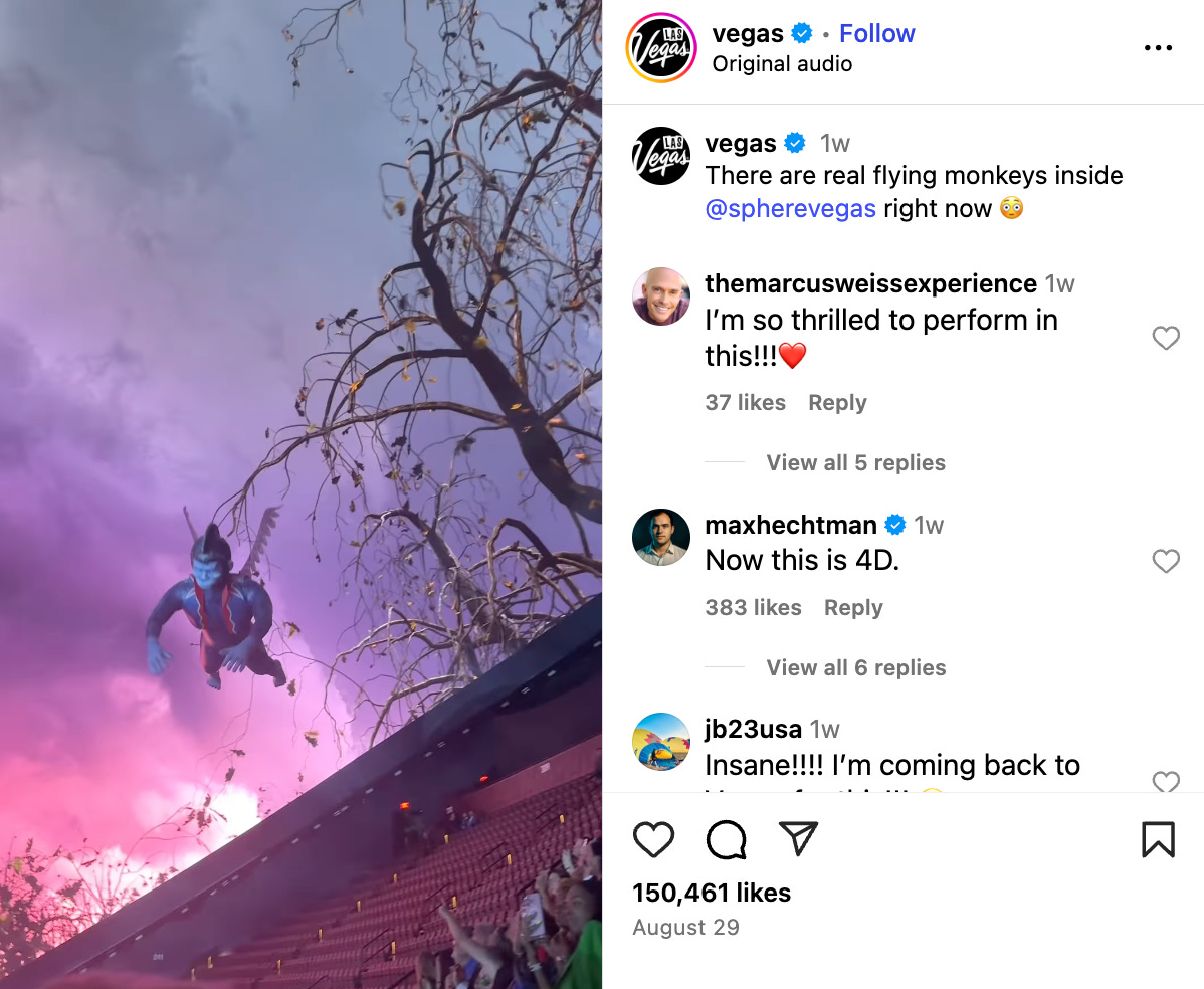 We also look at current post performance and adjust accordingly. We noticed our first “outside vs inside” Reel was not performing well, so we edited some new “inside vs outside" spots. We tried starting the video inside Sphere, which performed better. Every post is an opportunity to learn, so we post a lot. And the more we learn, the better we get.