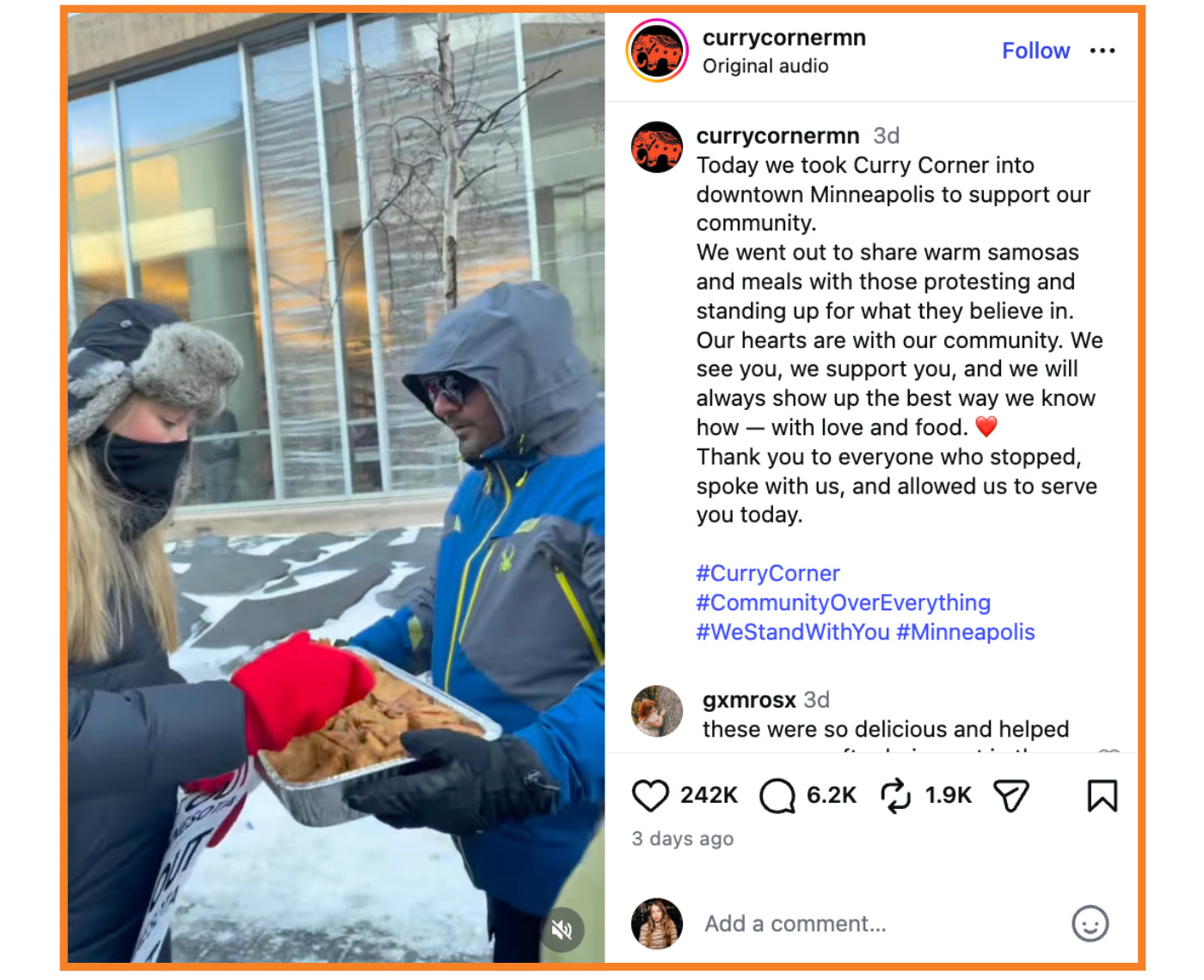 Then there are the local businesses in Minnesota that have been using their social media pages for action, likely paving the way for national brands to also find their voice. Curry Corner handing out warm vegetable samosas to protesters. Little Joy answering “Should a business stay neutral?”. Wrecktangle Pizza raising $200,000.