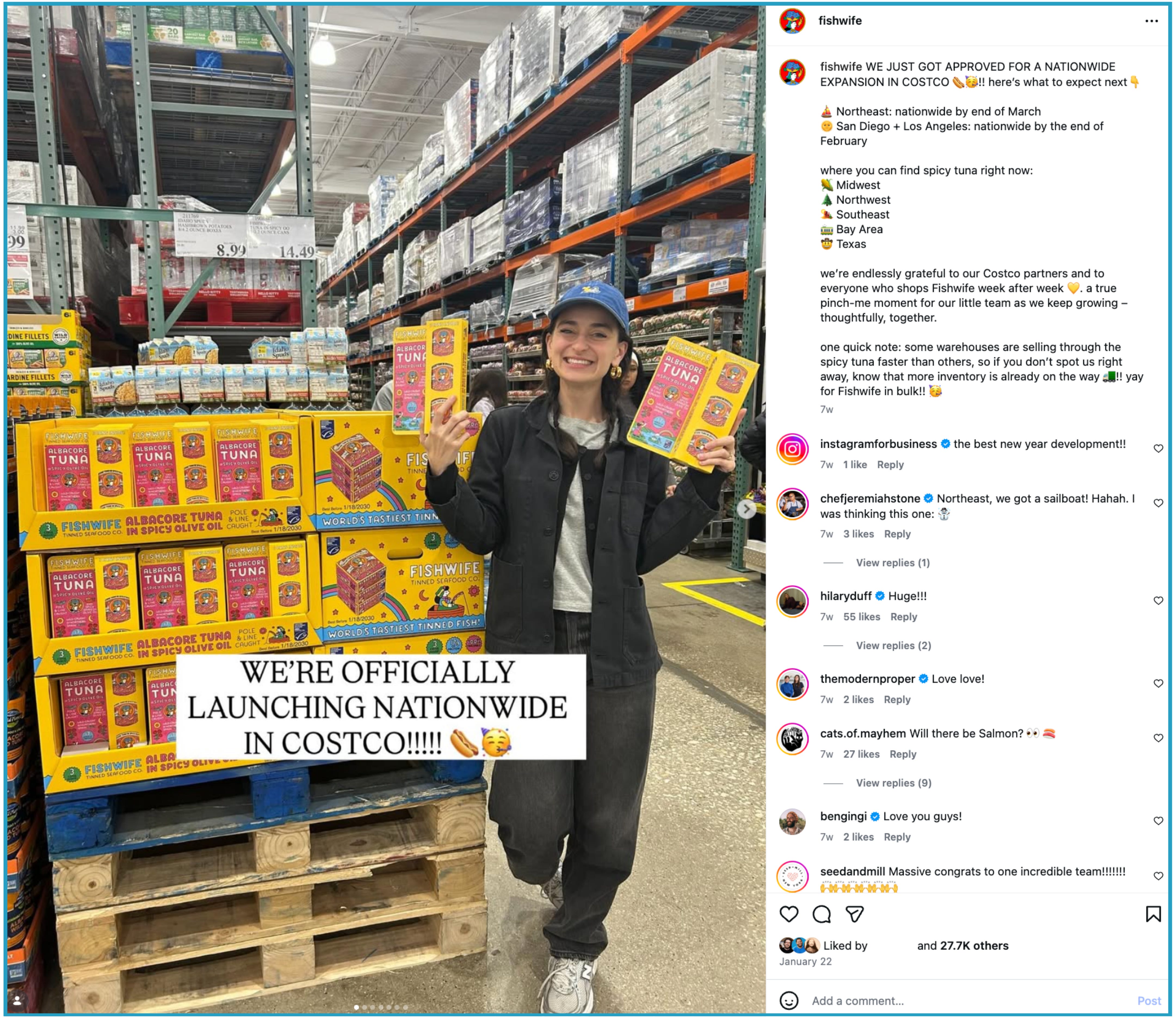 Lauren: It’s hard to say which individual posts drive sales, so I usually look at retail launches as a clearer signal. Our first Costco announcement is a standout. We first announced our Midwest rollout, and the number of organic UGC posts was a strong early indicator of excitement. One of our CTAs was to fill out a Costco request form (to request Fishwife at your local club), and so many sweet people submitted that Costco had to email us multiple times asking us to pause promotion—oops! The bigger takeaway is that Fishwife has been thoughtful about launching in retail when demand exists, rather than jumping in too early. That timing has been a key part of why our retail expansions work so well.