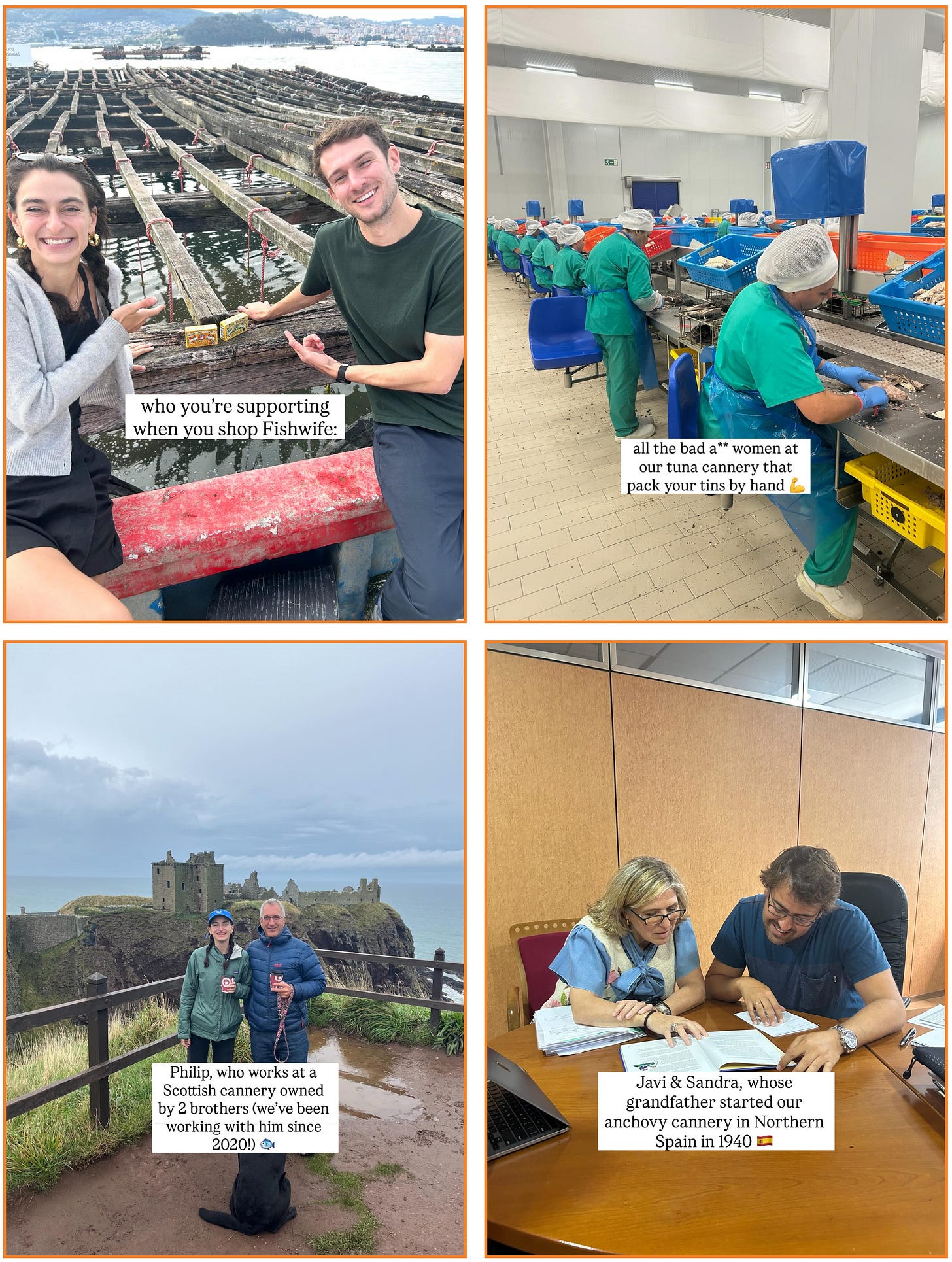 Becca: For most folks, seafood and its supply chain feel incredibly foreign and intimidating. This is where putting faces to the brand really helps, it brings the customer closer to the source. Instead of a stock photo of tuna swimming in open water, it’s a picture of me and our head of ops breaking bread with our cannery partners in Spain, Washington, Scotland, Denmark, Norway. All of them grew up in the regions we source from. For many, their ancestors founded the cannery, their families have spent generations carefully tending relationships with local fishermen and olive farmers. It’s just so much more human, much easier to envision and understand.