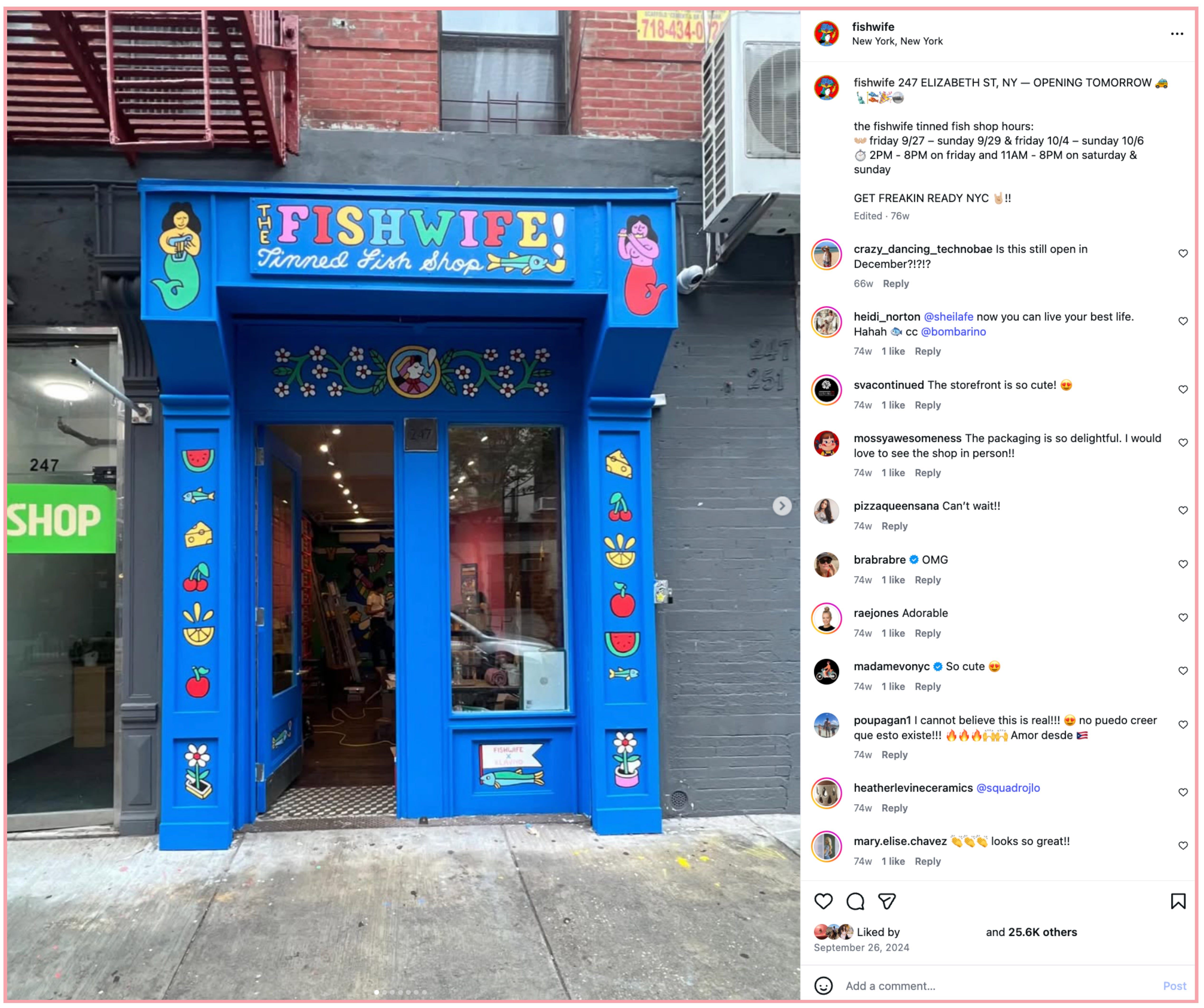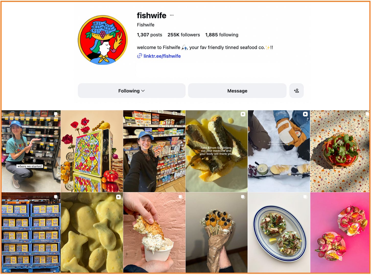 Lauren Murphy: Fishwife’s social media philosophy is rooted in making people ~feel~ something, blending emotional consistency with a warmly irreverent, funny (humble brag), and community-obsessed voice. Across every touchpoint (whether a recipe, meme, or retail announcement) the goal is to make tinned fish feel fun, culturally relevant, and deeply human.