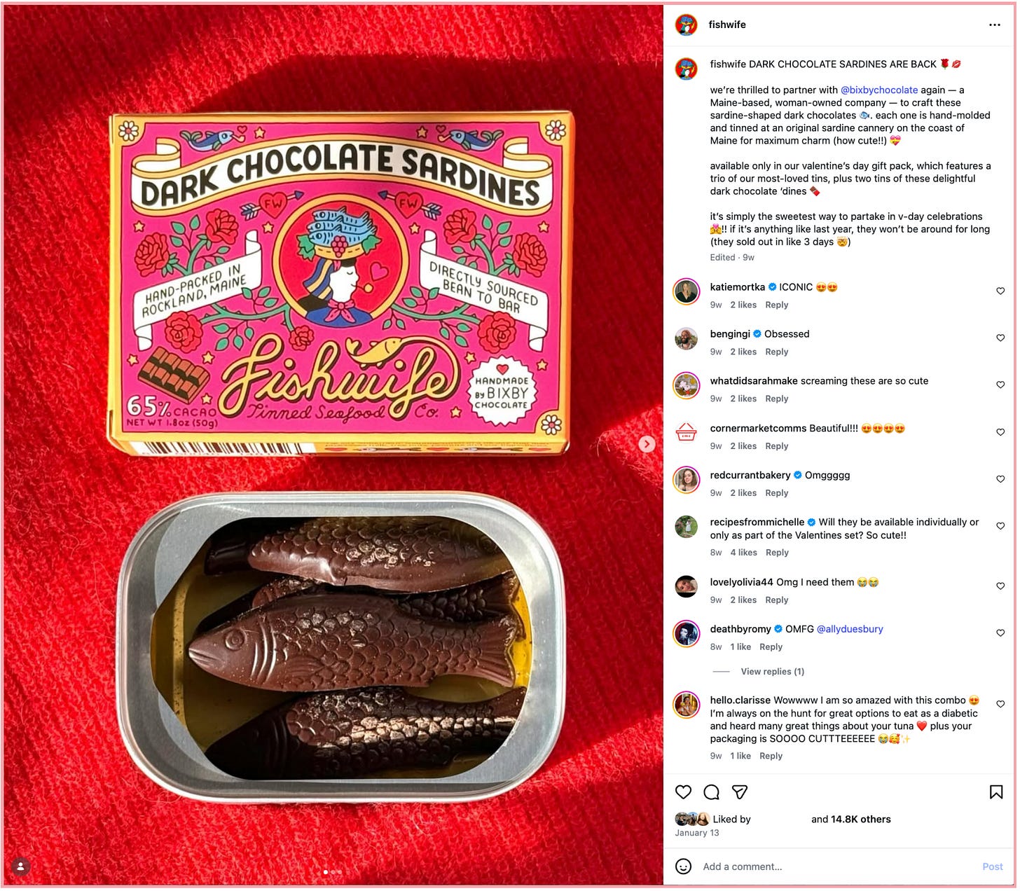 Becca: I remember that we launched the our Valentine’s Day chocolate sardines over email and SMS in the morning, and sales were doing solidly, but when we posted on IG, they popped off. There are certain items—tinned fish, merch, or anything in between (like choco sardines)—that we know are really going to resonate on social. If the price point is approachable, like it was with the chocolate sardines, conversion from social is much likelier to be high.