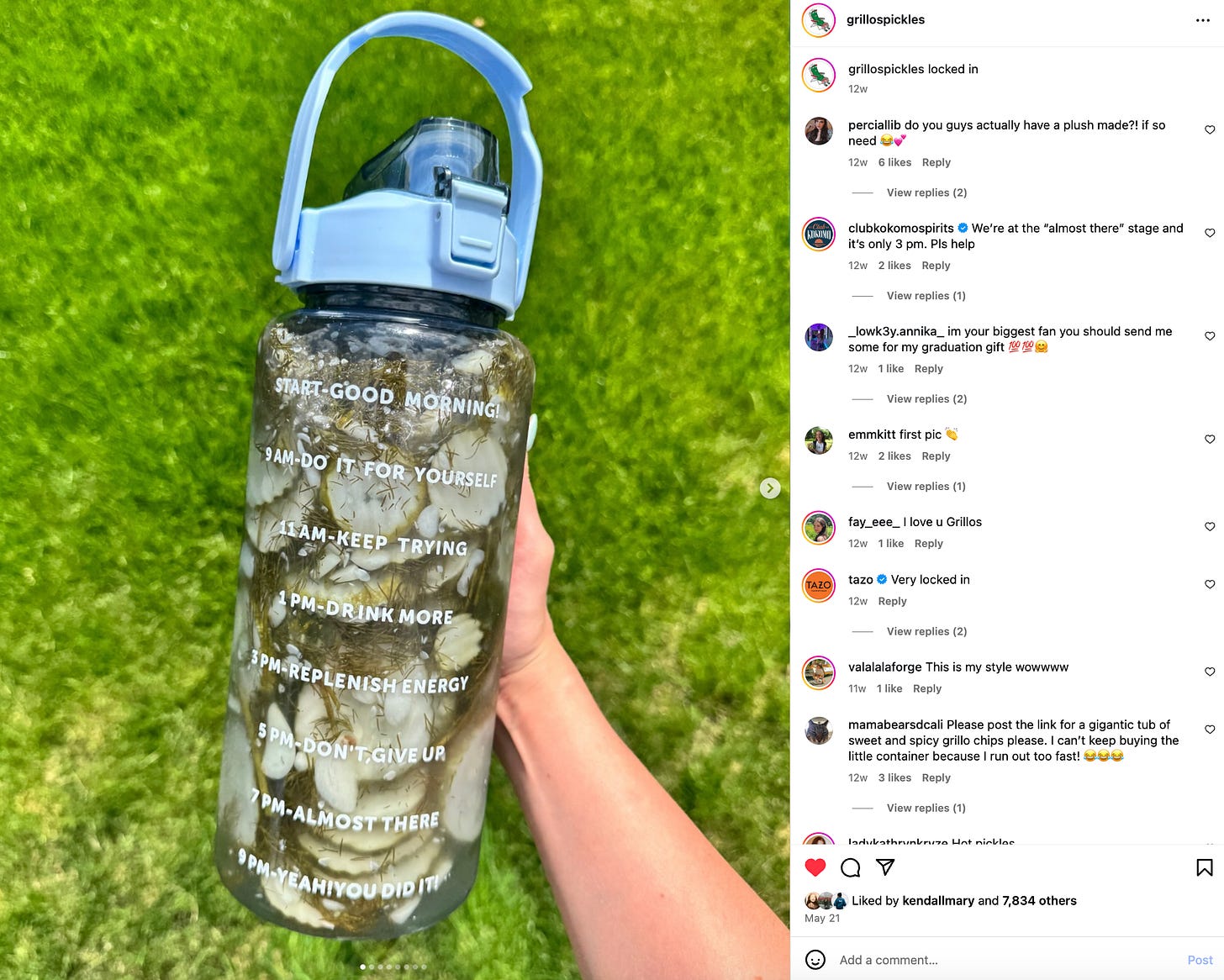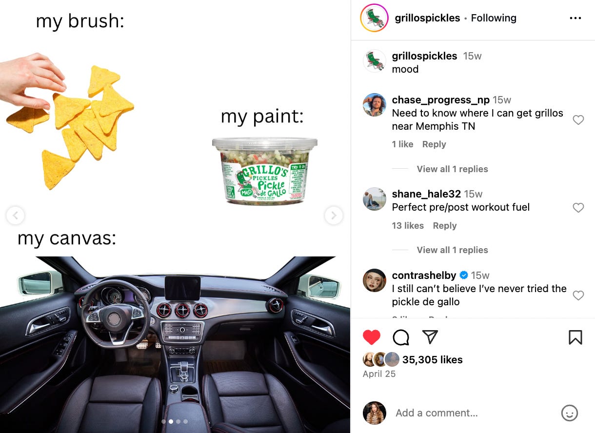 He’s got great taste. The absurdist social presence of Grillo’s is so fun to follow. That’s why I caught up with Madeline Lies, Digital Marketing Manager at Grillo’s Pickles, about building an account that feels like a pickle fever dream.