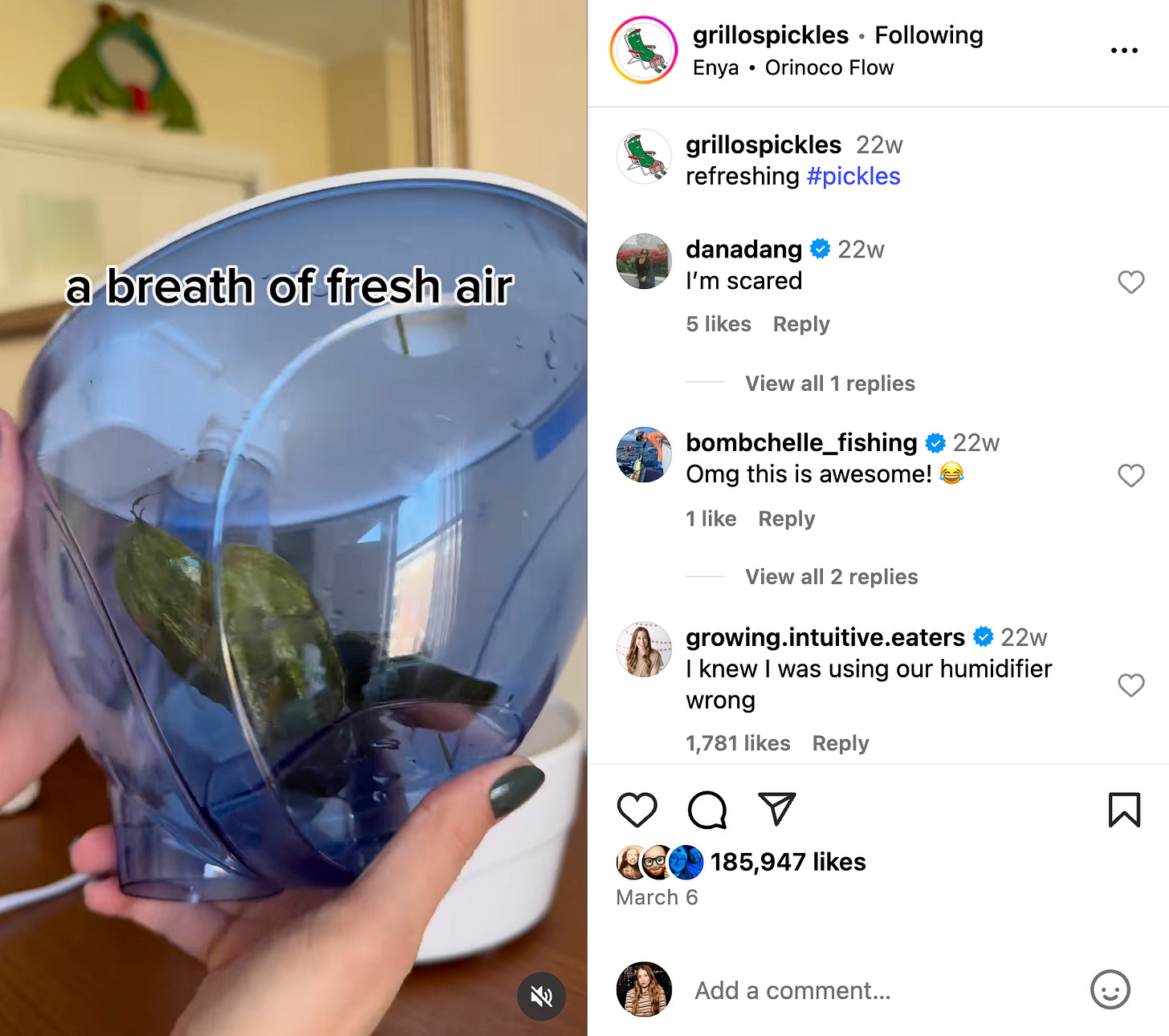 ML: Thanks so much! A little absurdity adds fun to the feed and keeps people coming back for more. We strive to incorporate layers of messaging in our videos. For example, the Pickle Humidifier came about to make people laugh during peak allergy season. We wanted to relate to something that was top of mind for people (allergy season → break out the humidifier) and warp it to fit the brand voice in a funny way. For anyone wondering: yes, it did make my apartment smell like pickles.