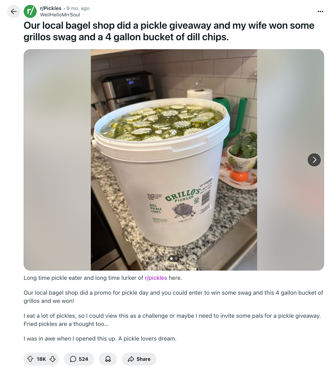 At events, we sample pickles via 4-gallon food service buckets. These are only available for sale to restaurant partners. In November, a restaurant gave a bucket of Dill Chips away for National Pickle Day, and the winner posted to Reddit. That became the top post of all time on r/pickles, and demand skyrocketed.