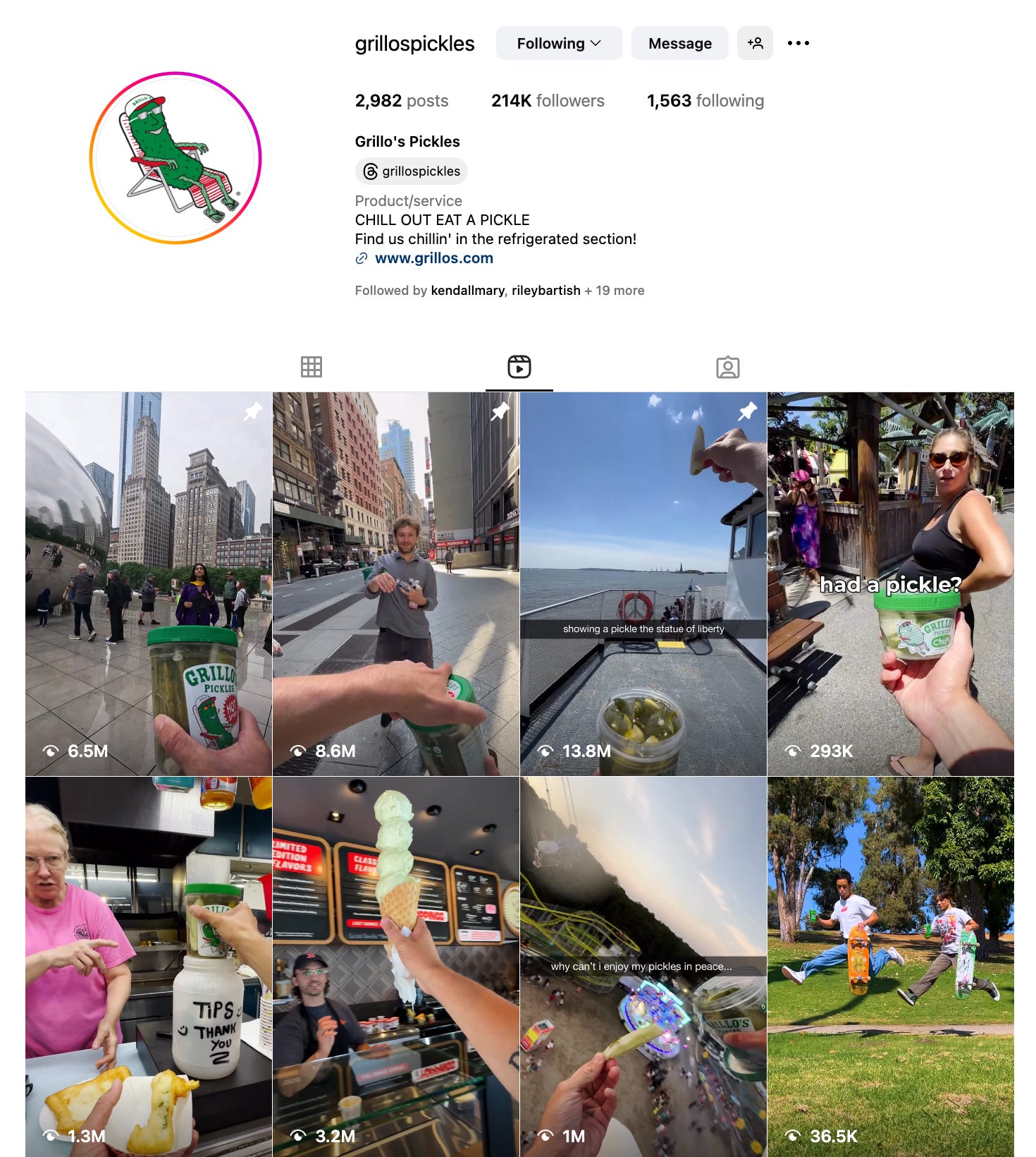 The brand has done such an impressive job of building what is essentially a fan account for pickles, not just Grillo’s itself. It’s working. The brand has garnered over 98M video views on Instagram this year. We talk about their posting strategy of “different songs from the same band”, how they utilize giveaways, and nurturing the relationship with their followers.