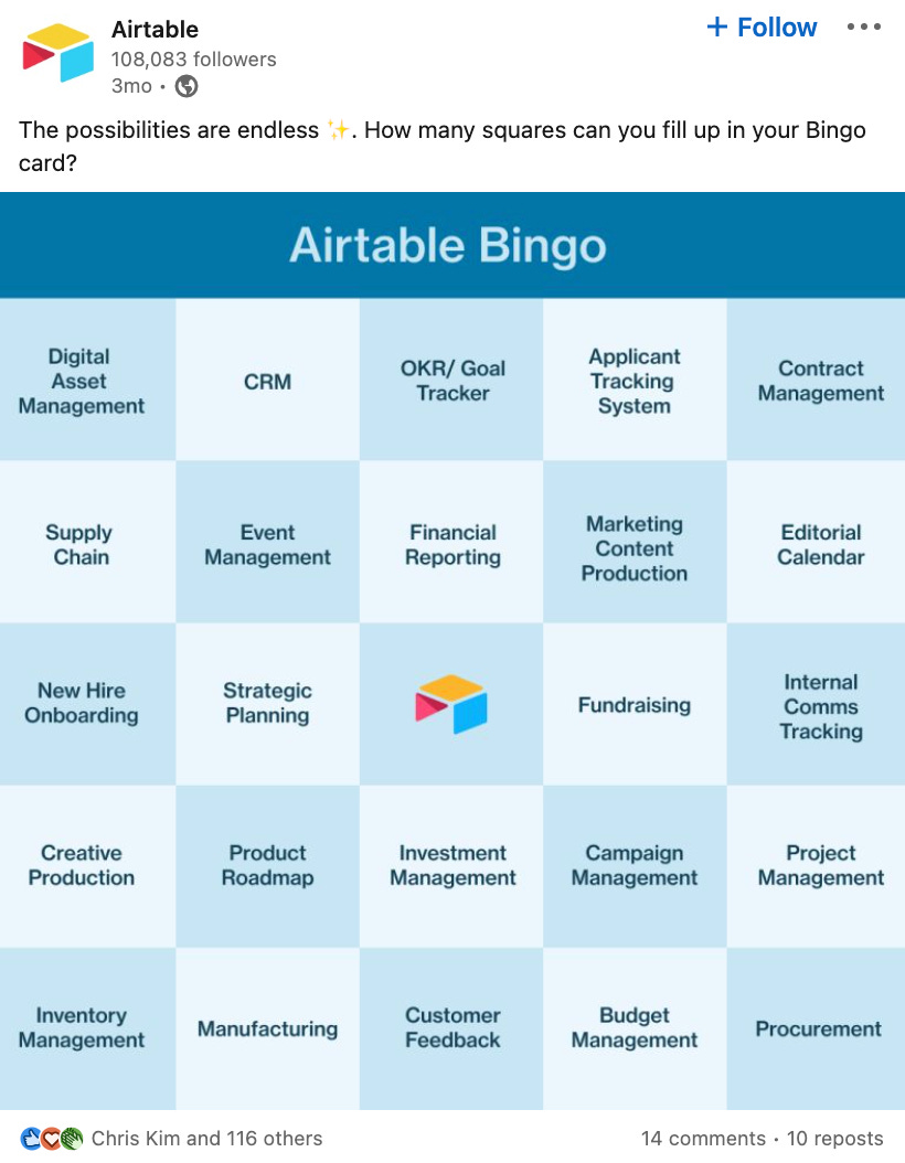 CK: We recently posted a Bingo card showing all the different ways you can use Airtable at work (in keeping with the Lego analogy). We're proud of this post for multiple reasons: