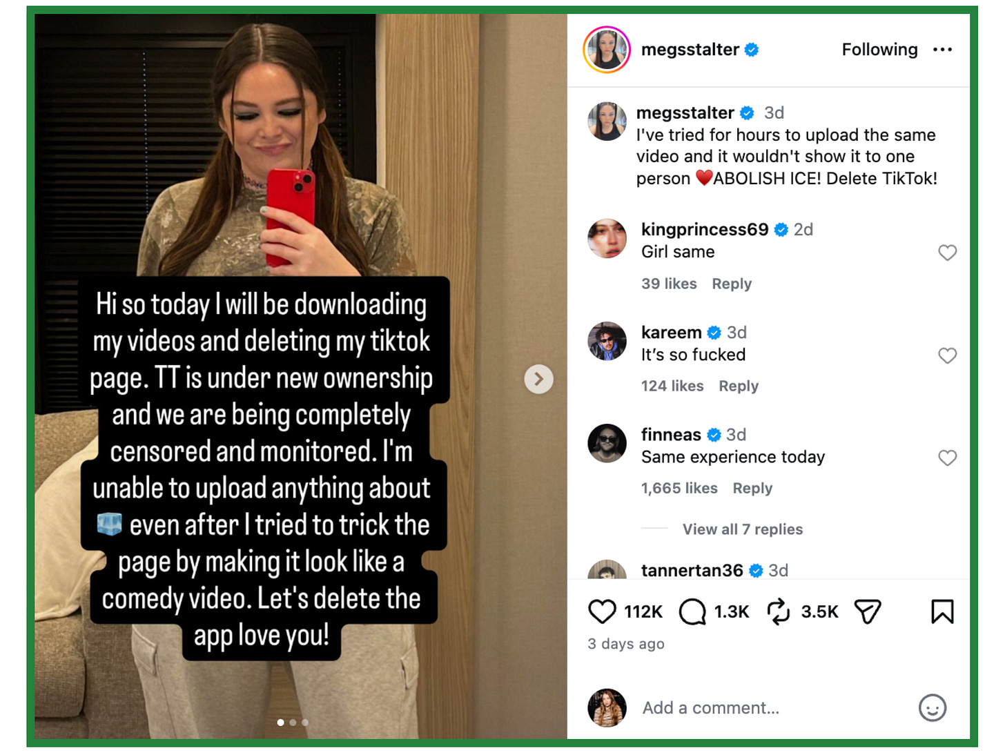 Over the weekend, there was an outage at TikTok. The biggest impact that users felt was that videos posted were showing 0 views. This glitch happened during a time where a lot of creators were also speaking out against ICE, resulting in follow up Instagram posts that accused the platform of censorship. Comedian Meg Stalter left the app altogether. As we all know, TikTok recently got new Trump administration-approved owners, complete with an updated privacy policy pop up. According to an article CNBC published on Monday, “TikTok users are deleting the app, with removals up 150% following U.S. joint venture.”