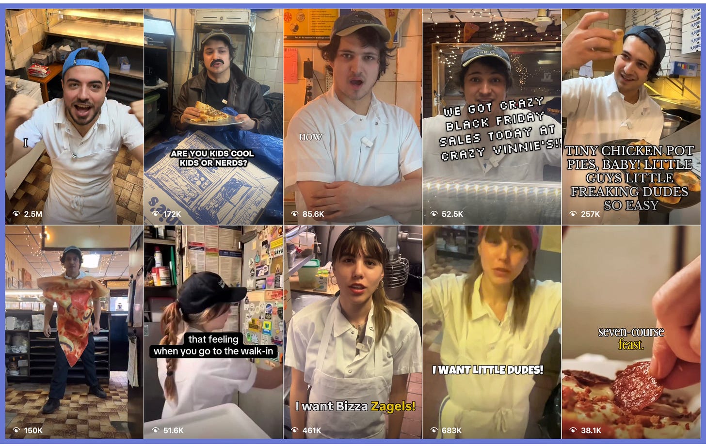 Vinnie’s Pizzeria’s account feels like a cheese-filled fever dream. The Brooklyn restaurant has become known for their Tim Robinson-coded sketches that are delightfully weird. This video with 500K views is somehow both about “bizza zagels” and facing our own mortality. In my Q4 Trend Report, I wrote about a style of content I jokingly called “AI could never”. Posts that are so kooky and weird that no amount of prompting could possibly get you there. Vinnie’s is the perfect example of just that. I had to know more about the team behind it.