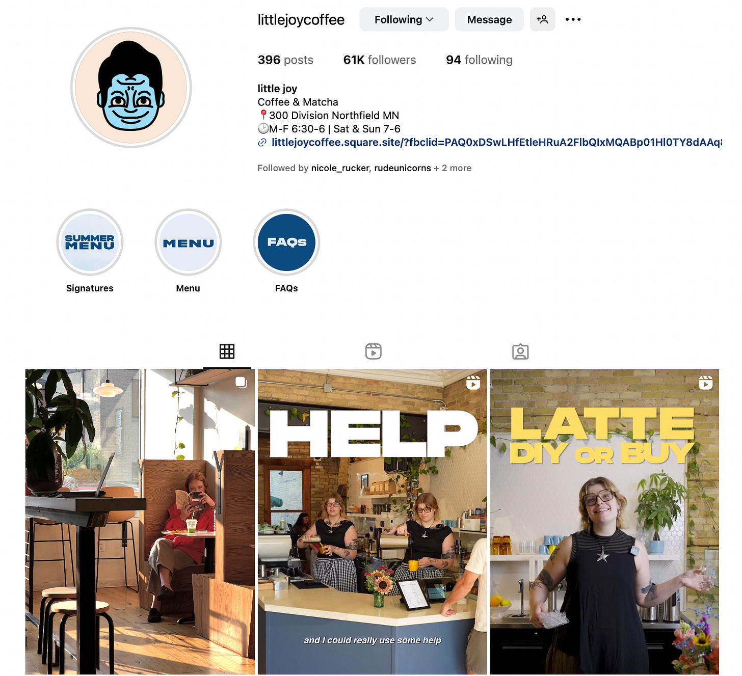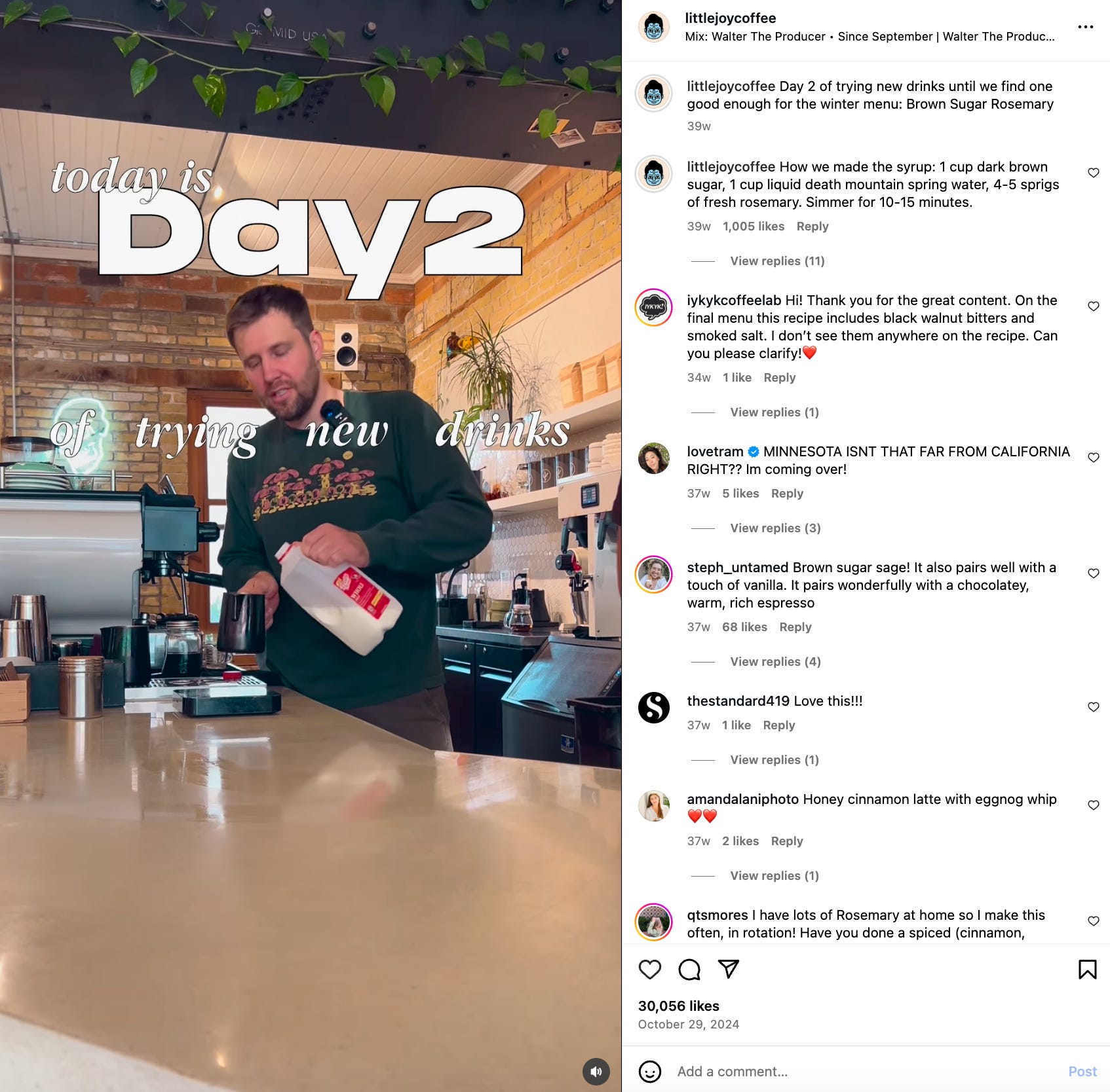 Earlier that day, I had reached out to Little Joy, a small coffee shop in Northfield, Minnesota that has built a dedicated following through focused series like “Day __ of trying new drinks until we find one good enough for the winter menu” and “Latte DIY or buy”. I had a few questions about their strategy that I planned to publish in an upcoming newsletter.