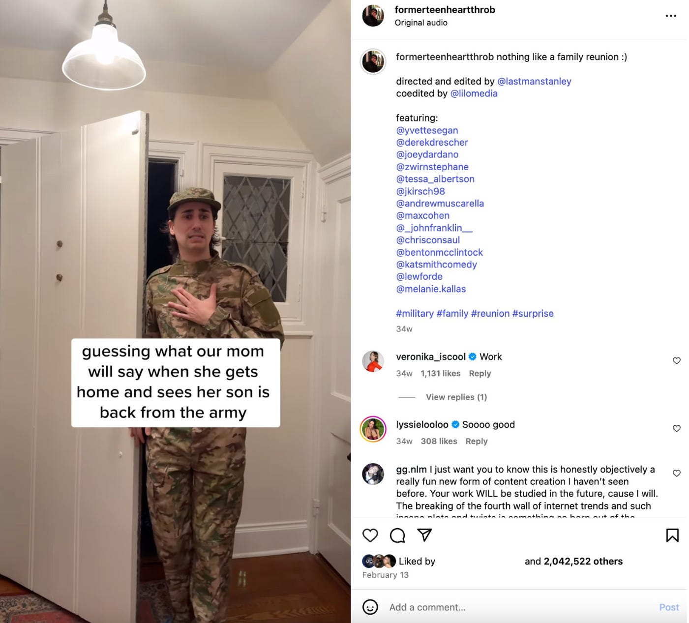 Across Instagram and TikTok, the video has over 57M views, 7.9M likes, and 835K shares. A comment with 88K likes reads, “I’m more impressed that they snuck an actual ad in there.” Same.