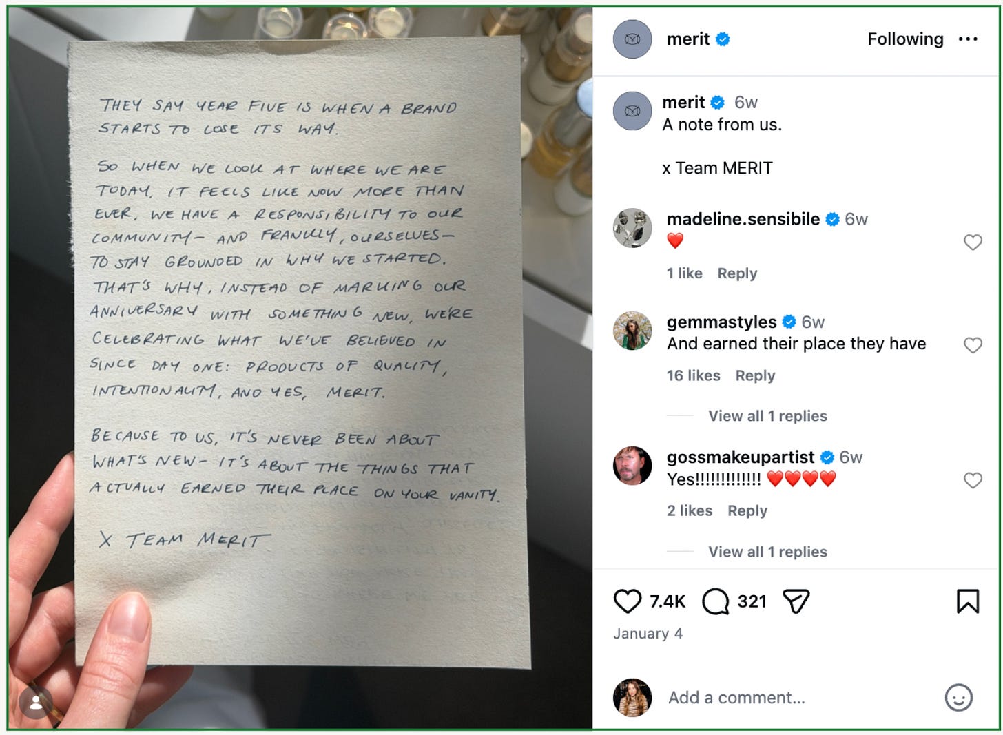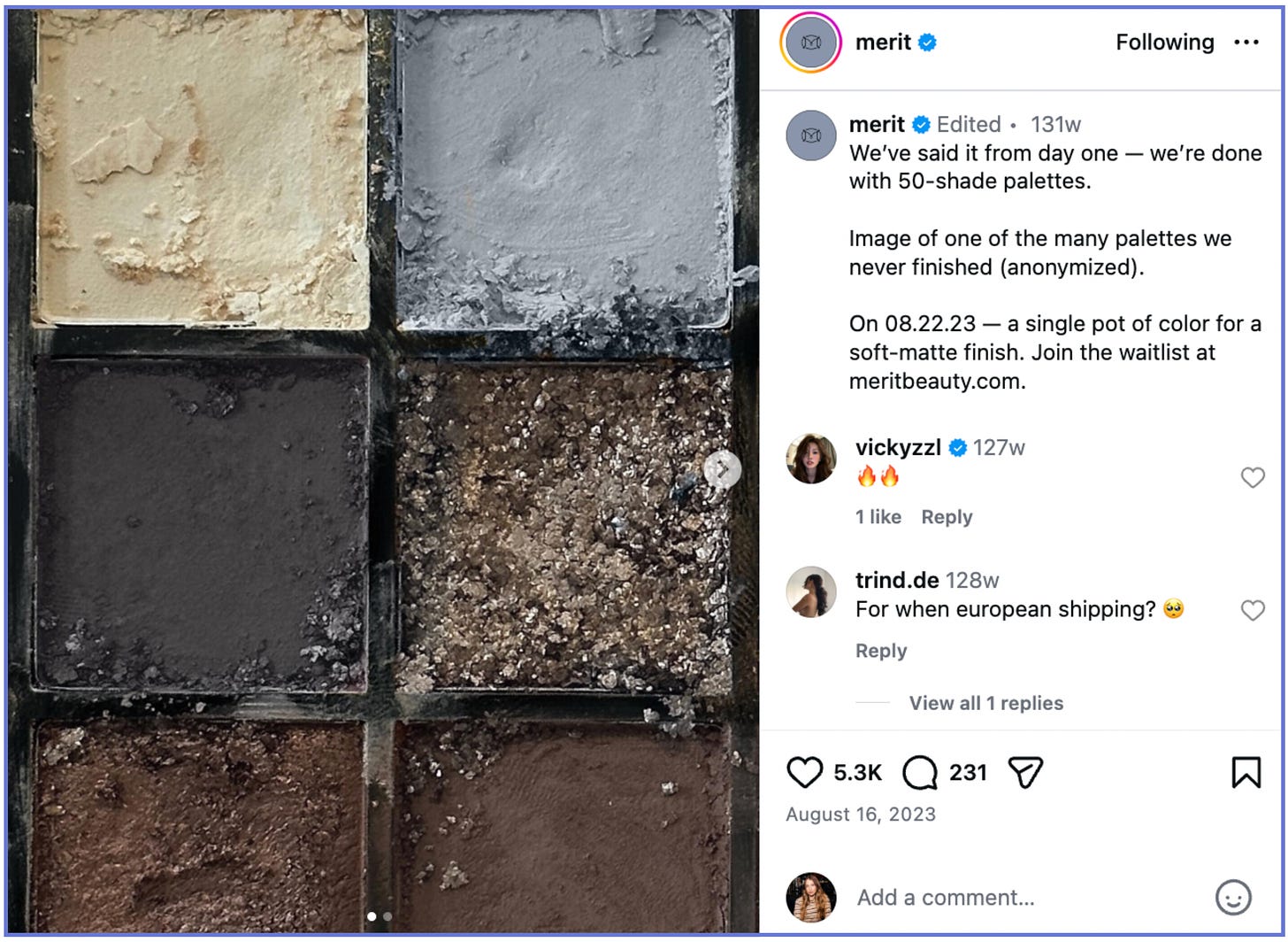 You can see a photo without product in it and know that it’s Merit because we built a brand, not just product marketing. It’s something that a lot of brands are still missing today because they think that every single post needs to drive revenue immediately.