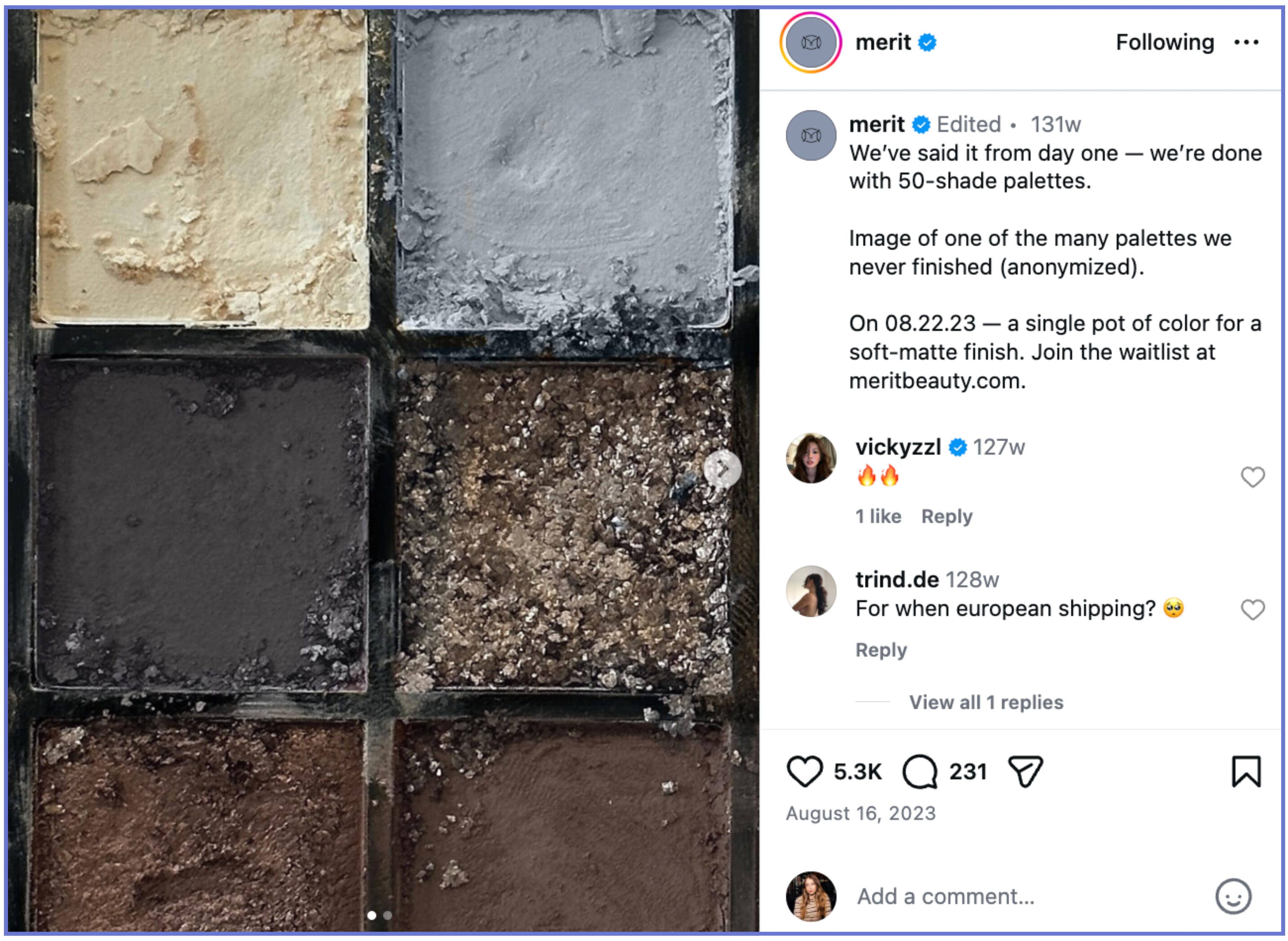 AM: It’s such a small thing, but we’re very clear on what we are and what we’re not. Right? Merit’s core consumer is Millennial and Gen X. We are 30 to 50-year olds. That’s who we serve. Gen Z is welcome to come join in. And it’s happening, but we know who we serve and we speak to her like she’s a grown adult and it’s such a subtlety, but I think it makes such a difference. I think if we were super trend driven, it would feel very asynchronous for the consumer.