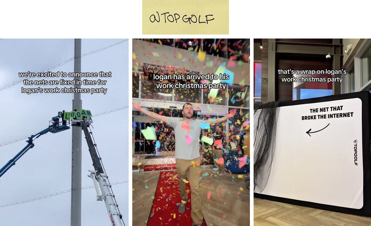 On December 27th, user @810ladyboss posted a TikTok of the net falling at the Topgolf’s Auburn Hills location. Someone named Logan Phillips commented “They better have that fixed by January 9th my work Christmas party is there”. That comment currently sits at over 300K likes. Nili Kamolidinova, Social Media Manager at Topgolf, tells me over email, “As we saw the comment garner more and more likes, we knew this was something the internet had collectively decided to care about and an opportunity for us to join in on the fun.” The brand then turned the inside joke into various viral posts, tracking the progress of the net and ultimately throwing an epic Christmas party for Logan.