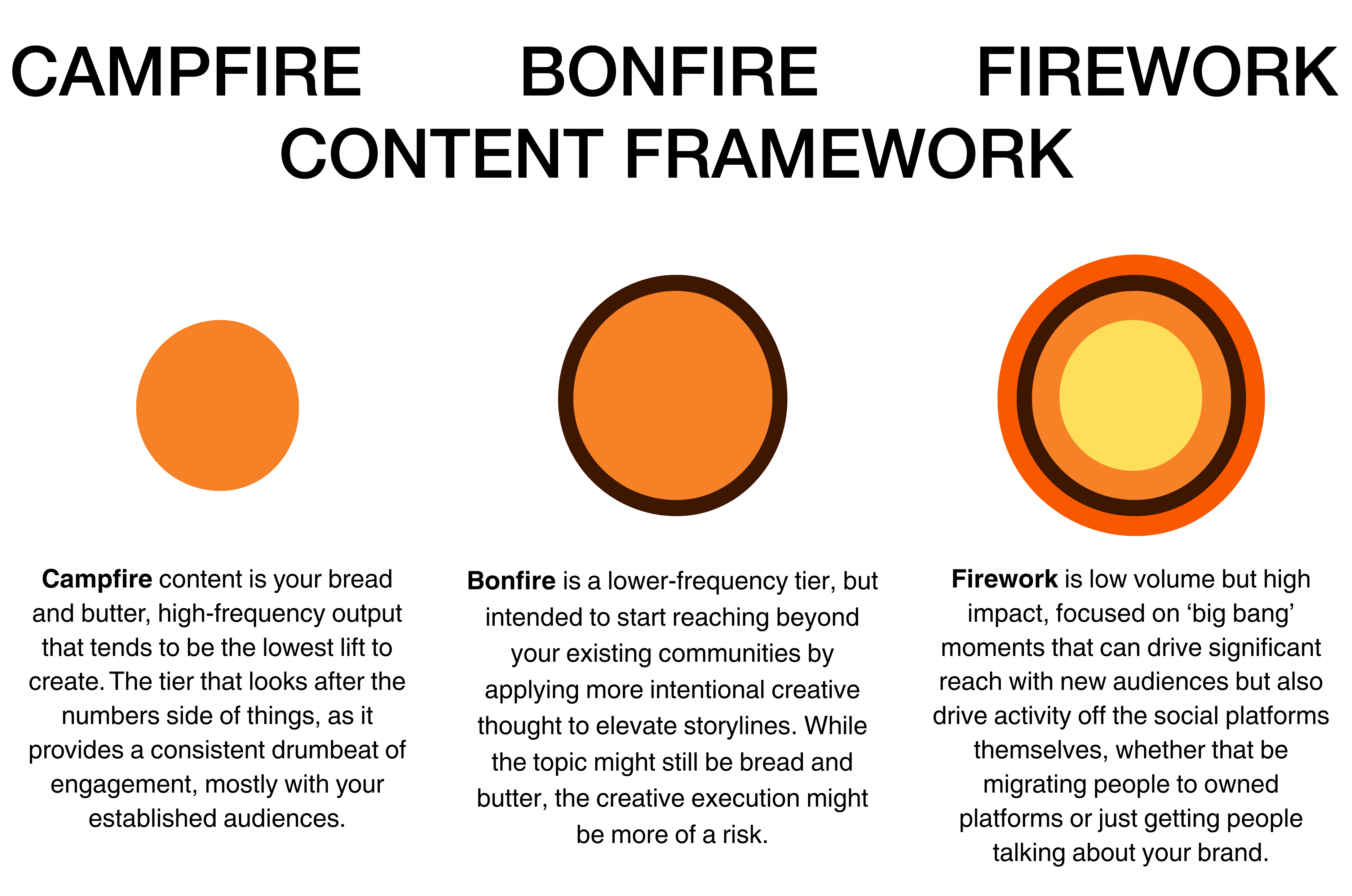 Campfire -> Bonfire -> Firework is such a neat framework! I love how simple and effective it is in categorizing the content between the one that feeds the current community vs the one that attracts the new fans.