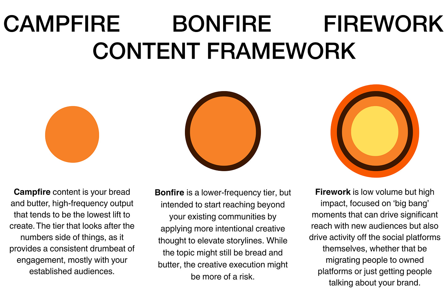 In short, there’s a lot. We use a broader, three-tier framework when deciding where to dedicate resources and budget. We refer to these tiers as “campfire, bonfire, and firework”, which relate to the intended impact of different content strands.