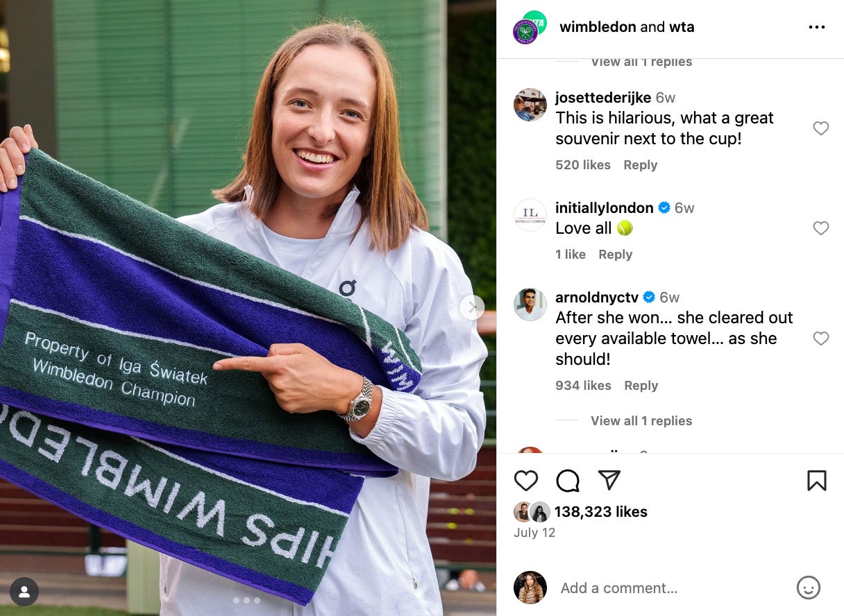 Operate like a newsroom. For us, this means people are empowered to use their editorial and creative expertise to extend the impact of emerging narratives and make them work harder for us. To give an example, there was a running joke this year that Iga Swiatek loved the player towels and was taking them with her after matches—as she’s allowed to do! We leaned into this as the tournament progressed, but when she actually won Wimbledon we had the idea to embroider a personal towel for her and surprise her with it after the final, getting her reaction on camera. For me, this is where social media can come into its own and facilitate reactive ideas that can elevate storylines and drive further engagement.