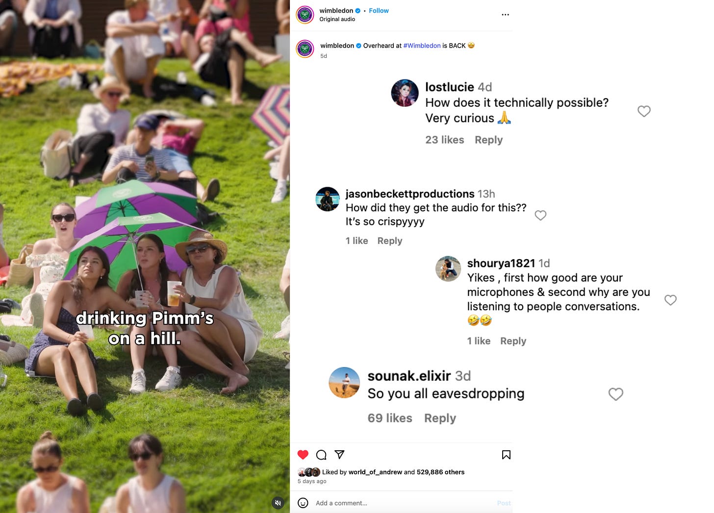 While on their commute home on the underground, one member of our team also saw someone in the act of sharing an Overheard at Wimbledon episode with their WhatsApp group chat. That is, in a nutshell, what we are trying to achieve: building our relevancy with people and showing up authentically in their feeds.