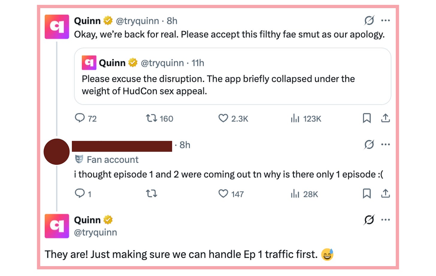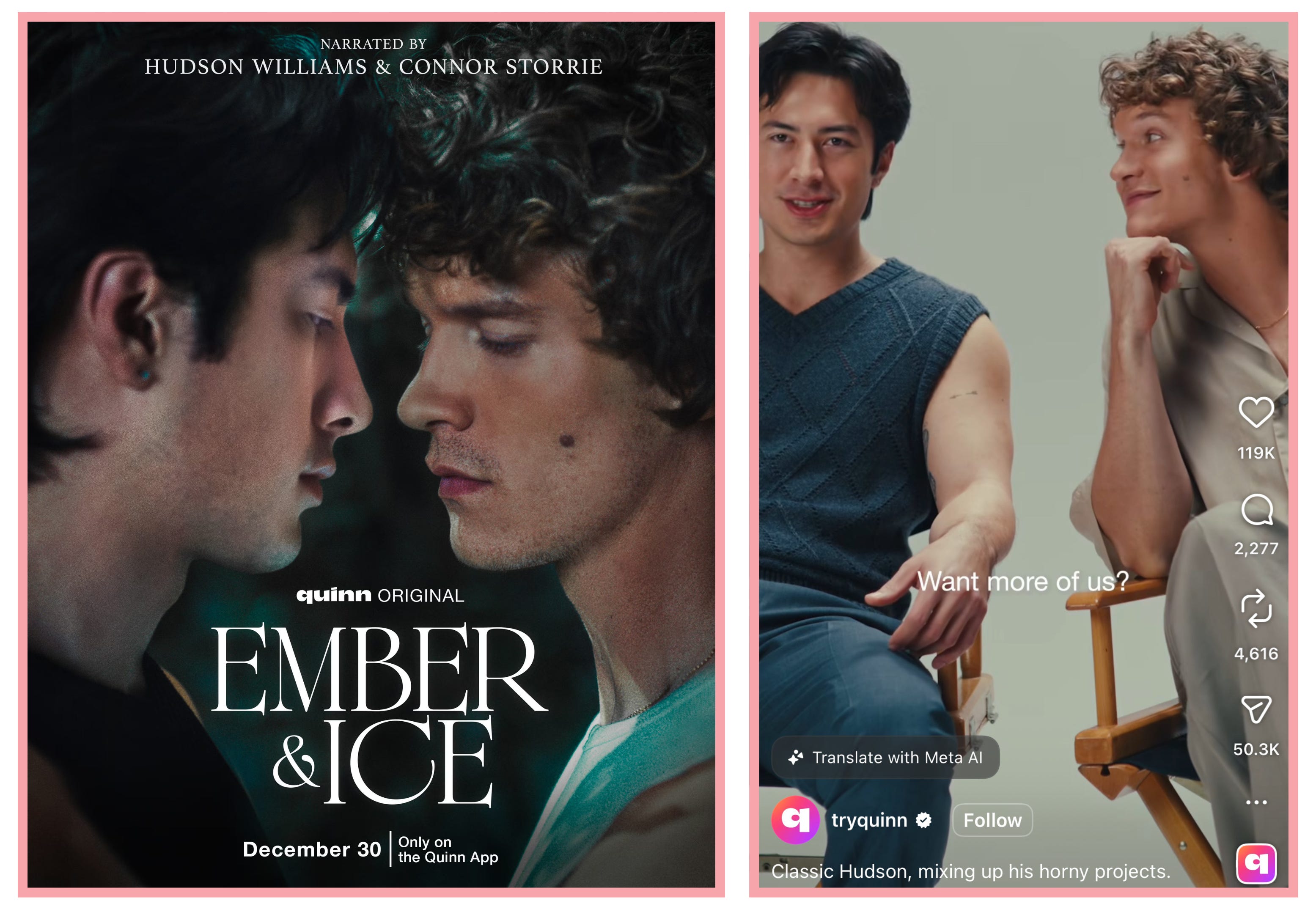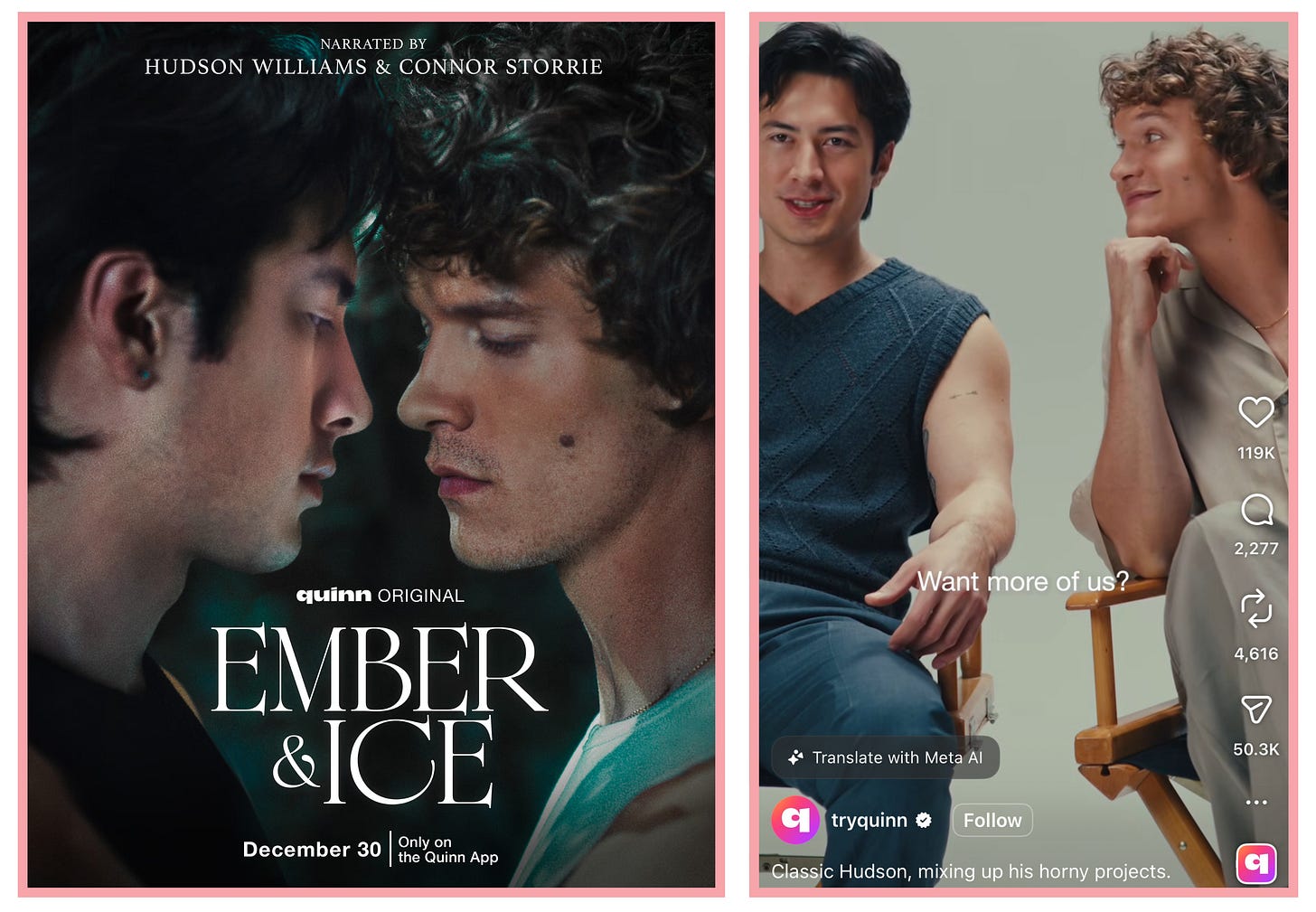I wasn’t planning to send another newsletter this year, but then a post from Quinn, an audio erotica app, came across my feed. They were teasing their new romantasy series narrated by none other than Hudson Williams and Connor Storrie. The caption? “We did what had to be done.” It was filled with comments like “SHAKING” and “Whoever secured this deal deserves a raise omfg GOATTTT”. Less than one month from the premiere of Heated Rivalry, the Quinn team had pulled off a full blown campaign with the two leading actors.