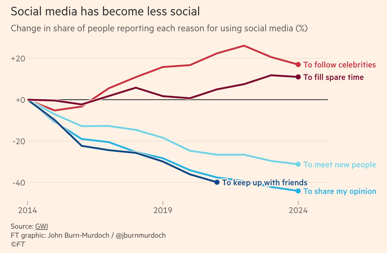 I’ve been thinking a lot about regrettable minutes. That feeling when you come out of a deep scroll, barely remember anything you just watched, and are annoyed at yourself for even spending your time that way in the first place. It’s a term I’d heard before, but was reminded of it while listening to a recent episode of The Colin and Samir Show. We spend so much time in social media apps but how much of it actually feels worth it once we’re out? In a recent Financial Times article by John Burn-Murdoch he shared a graph that showed “people reflexively opening the apps to fill up spare time has risen, reflecting a broader pernicious shift from mindful to mindless browsing.”