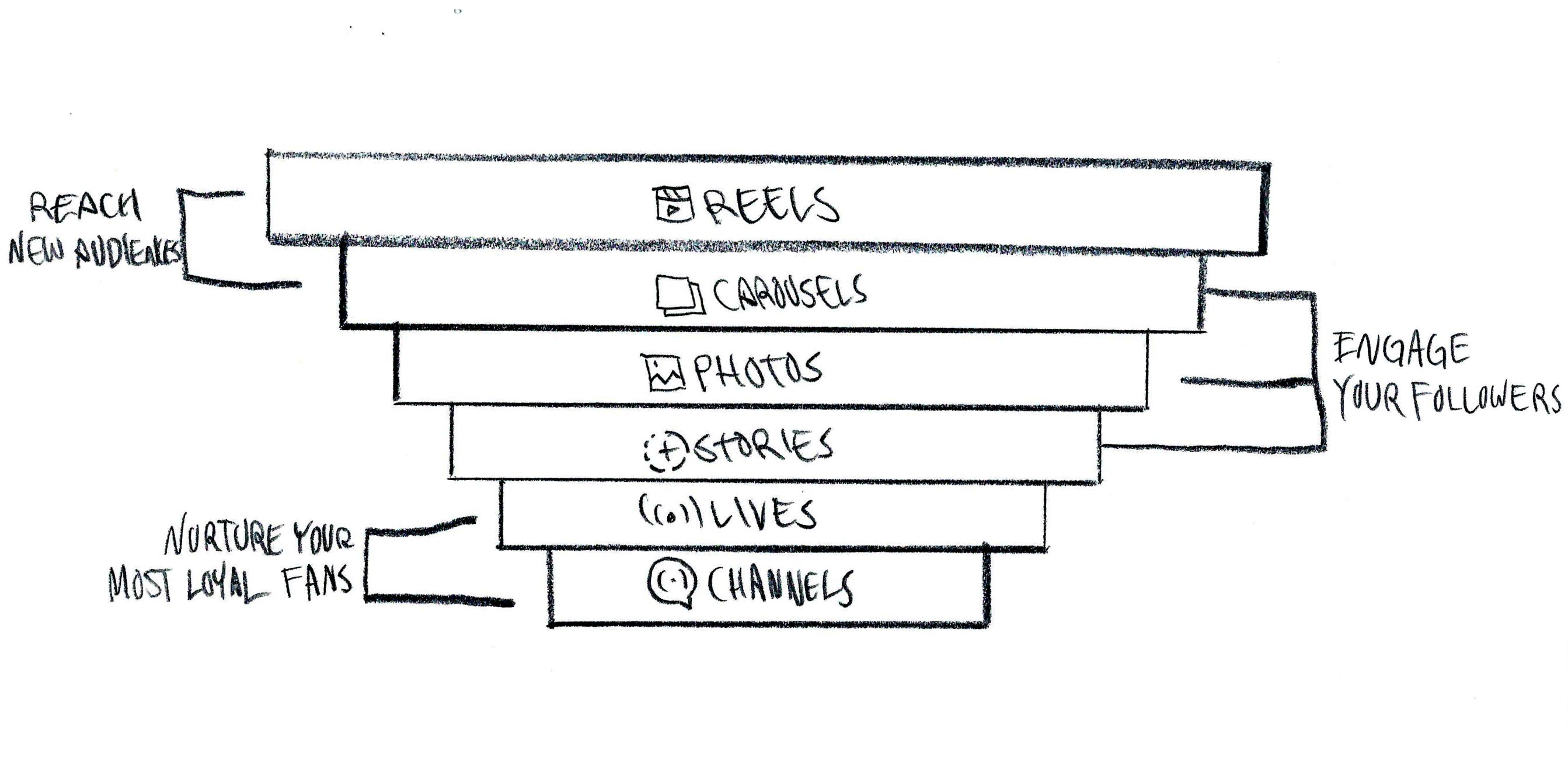 Below is a sketch of the funnel Instagram shared with Link in Bio readers earlier this year. In it they broke their app down by features and what each one is for. It’s important to note that some of these features have their own algorithm—the Reels algorithm is different than the Instagram Stories algorithm.