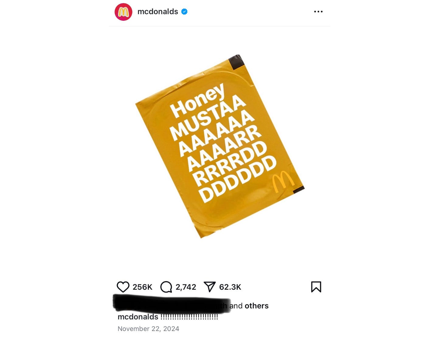 By worrying less about hitting a specific amount of posts per week, McDonald’s is able to leave room to react quickly to cultural moments with posts like this and this—while also clearly investing in smart, forward-looking creative for campaigns. I dug into the numbers of some other popular brands on Instagram to see how often they were posting—Liquid Death averaged around two posts per week in 2024, Xbox averaged around three posts per week, and Nutter Butter, one of the most talked about brands last year, averaged around 2 posts per week.