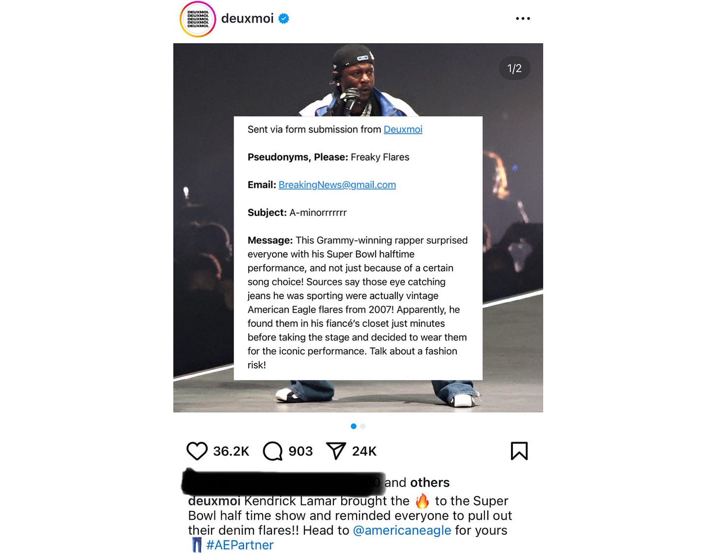 Last week gossip Instagram account DeuxMoi shared a sponsored post with American Eagle. It was a “blind item” that Kendrick’s Super Bowl jeans, despite being widely reported as Celine, were “actually vintage American Eagle flares from 2007!”. The sponsored post uses a photo of Kendrick Lamar and is disclosed with #AEPartner.