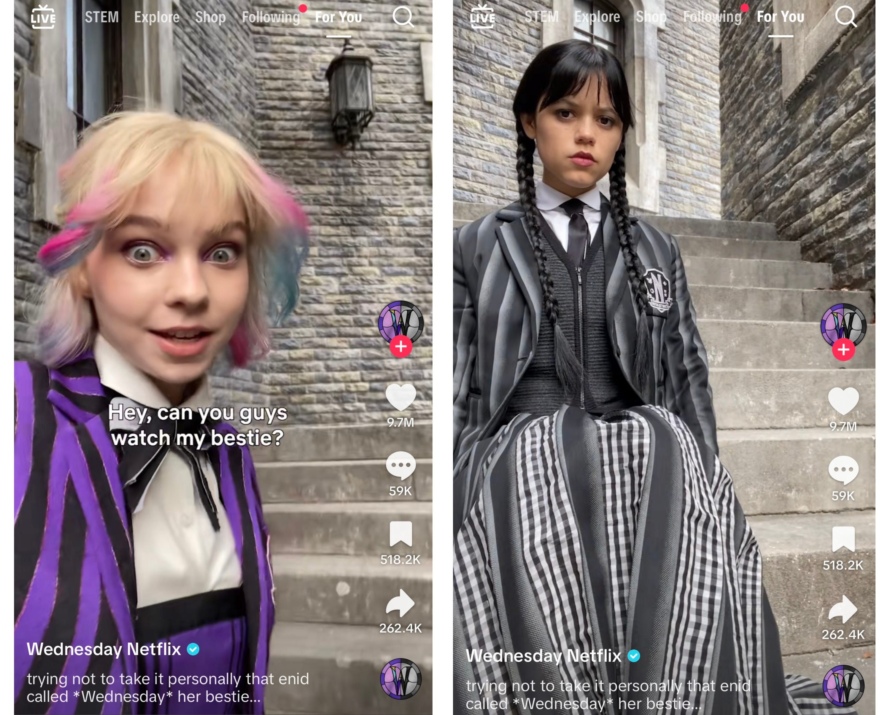 RK: The pre-release campaign for season two (part one) of Wednesday generated 3B owned social impressions. I hear that broke the record for Netflix’s largest pre-launch social campaign ever. I remember seeing a really clever post where it was the trend where it looks like the car is going to hit the person talking but it never does—but it was Wednesday and a hearse. Clever twist. What are some of the most successful social-first posts from that pre-release campaign? Why did they work so well?